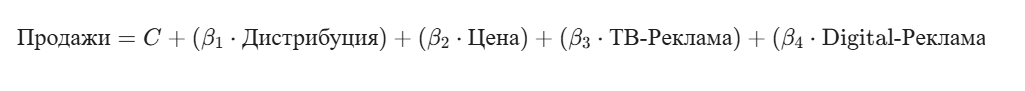 - Дистрибуция, Цена, Реклама (Независимые переменные): Это факторы, которые оказывают влияние на продажи. Каждый фактор имеет свой собственный коэффициент вклада.